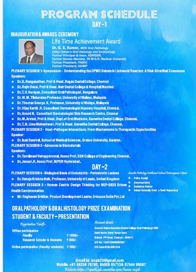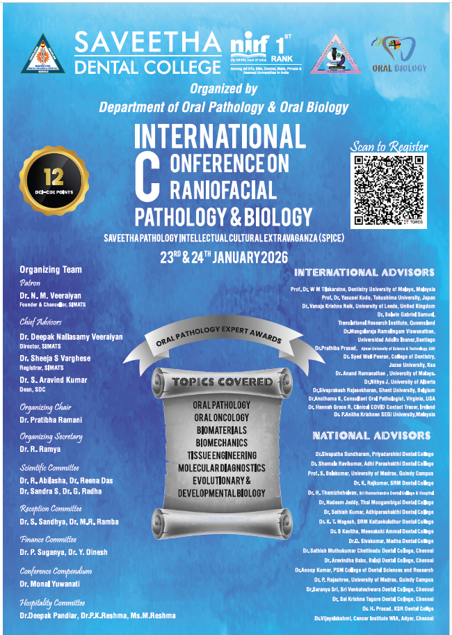The Department of Oral Pathology & Oral Biology, Saveetha Dental College, under SIMATS, successfully hosted the 4th International Conference on Craniofacial Pathology & Biology (ICCPB 2026) on January 23 and 24, bringing together national and international experts to deliberate on Oral Lichenoid Disorders (OLD). The conference was presided over by Dr. N. M. Veeraiyan, Chancellor, SIMATS; Dr. Ashwanikumar, Vice Chancellor; Dr. Sheeja Varghese, Registrar; Dr. Aravind Kumar, Dean, SDC; Dr. Nadeem, President, IAOMP; and Dr. Gururaj, Secretary, IAOMP, and was accredited with 12 DCI-CDE points. Following the welcome address by Dr. Ramya Ramadoss, Organising Secretary, the highlight was an international, consensus-driven panel moderated by Dr. Pratibha Ramani, Organising Chair, with experts Dr. K. Ranganathan, Dr. Rajiv Desai, Dr. T. V. Narayan, Dr. W. M. Tilakaratne, Dr. Thomas George K., Dr. Vijay Kartik R., Dr. Anand N., Dr. M. Arvind, and Dr. T. N. Uma Maheshwari, addressing diagnostic challenges, malignant potential, and clinicopathologic standardization in OLD. The conference also announced the successful international publication of the OSMF consensus report from the previous ICCPB edition. Scientific highlights included a keynote by Dr. Isak Demirel on host–pathogen interactions and the signing of an MoU with Örebro University, Sweden. Plenary sessions by Dr. Tamilmani Vairapperumal, Dr. Janani R., and Mr. Raghavan Sridhar emphasized interdisciplinary innovation in biomaterials and healthcare. A major milestone was the institution of the “Dr. N. M. Veeraiyan Global Top Five Oral Pathologist Award”, to be conferred annually from 2027. The Lifetime Achievement Award was presented to Dr. G. S. Kumar for his four decades of service, academic leadership, and role as Editor of Orban’s Textbook of Oral Pathology. The conference concluded with a vote of thanks by Dr. Monal Yuvanati, Assistant Dean of Faculty.